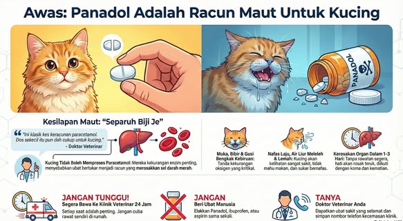 Apa yang berlaku dalam badan Oyen? Kucing tak ada enzim yang cukup untuk pecahkan paracetamol (acetaminophen). Bahan tu bertukar jadi toksik, serang sel darah merah (sebab tu gusi biru & nafas susah), kemudian hancurkan hati dengan cepat.